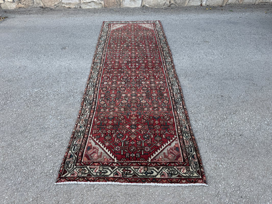 3x9 Vintage Hamadan Runner Rug – Hand Knotted Persian Wool Rug, Red Traditional Hallway Rug- sku2059