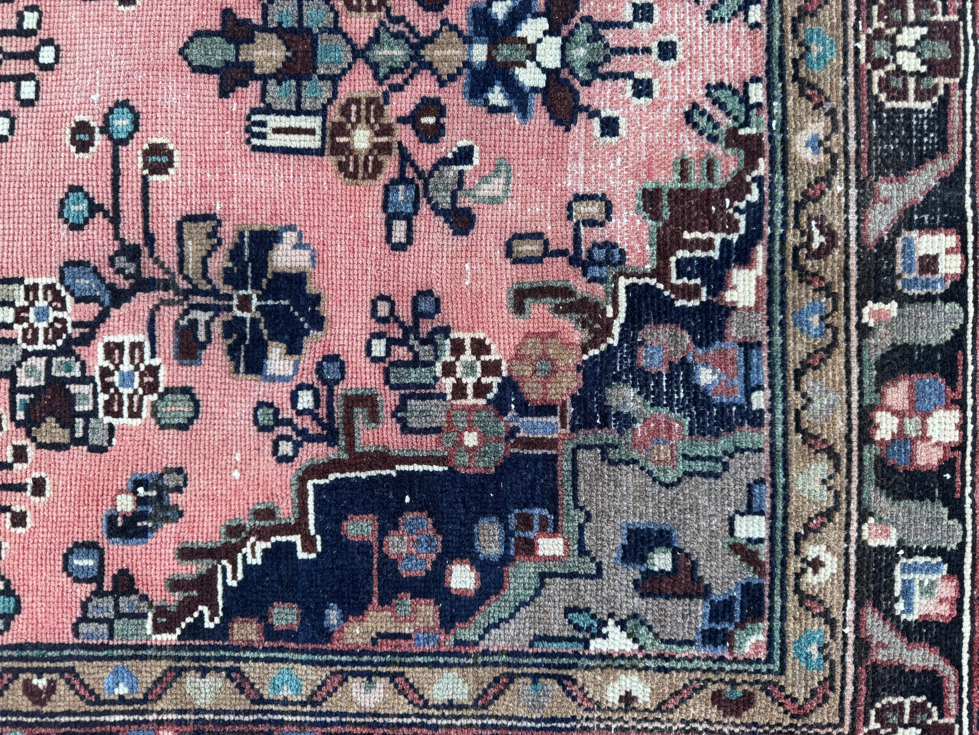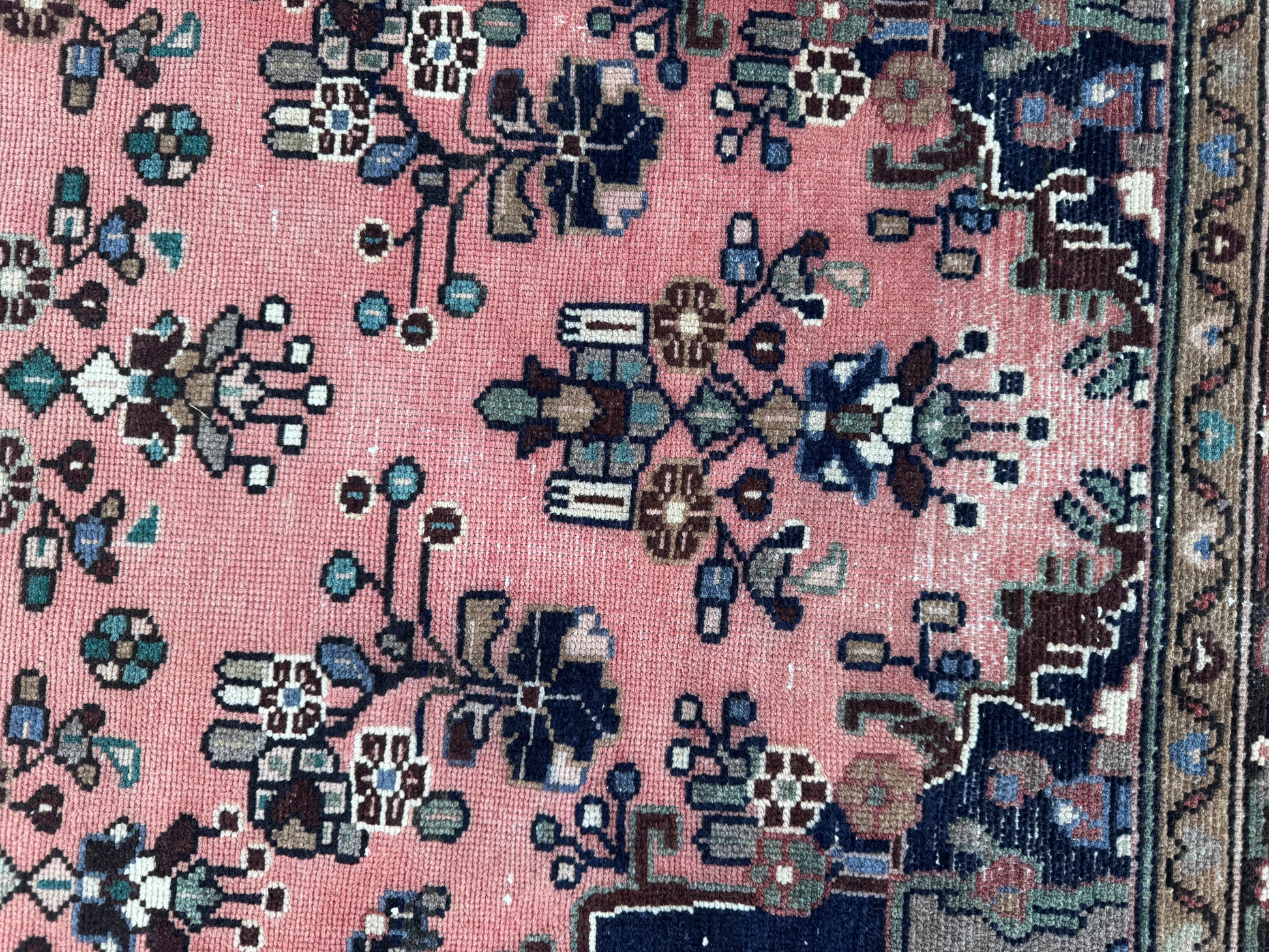 Featuring a warm pink field contrasted with deep navy and earthy accents, this rug offers a perfect balance between traditional Persian design and modern aesthetic appeal. The intricate motifs and soft color transitions create a cozy yet refined atmosphere.