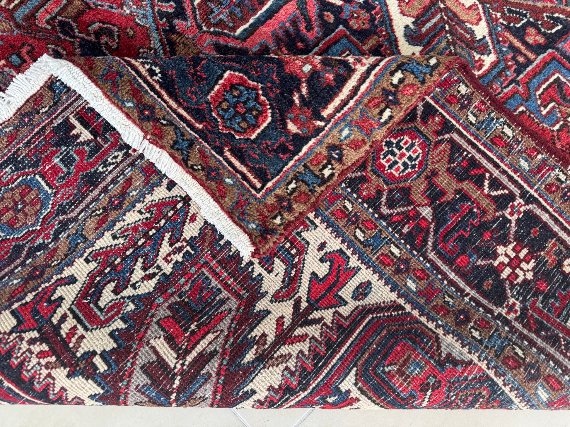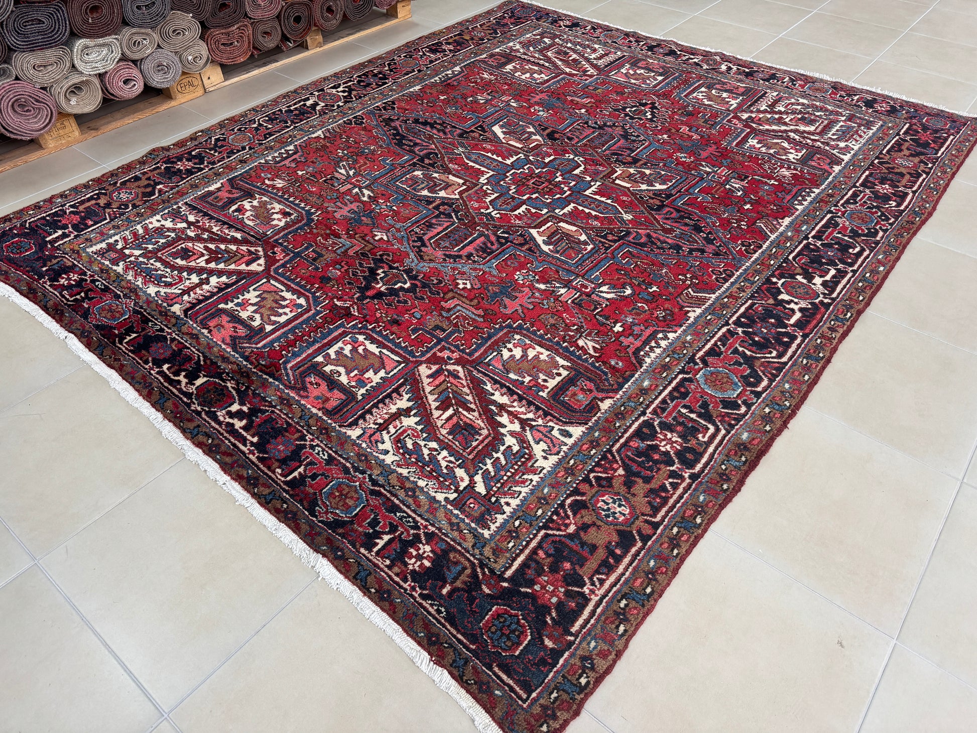 Vintage Heriz Wool Rug 8x9 ft – Hand Knotted Persian Tribal Red Blue Area Rug (1960s)