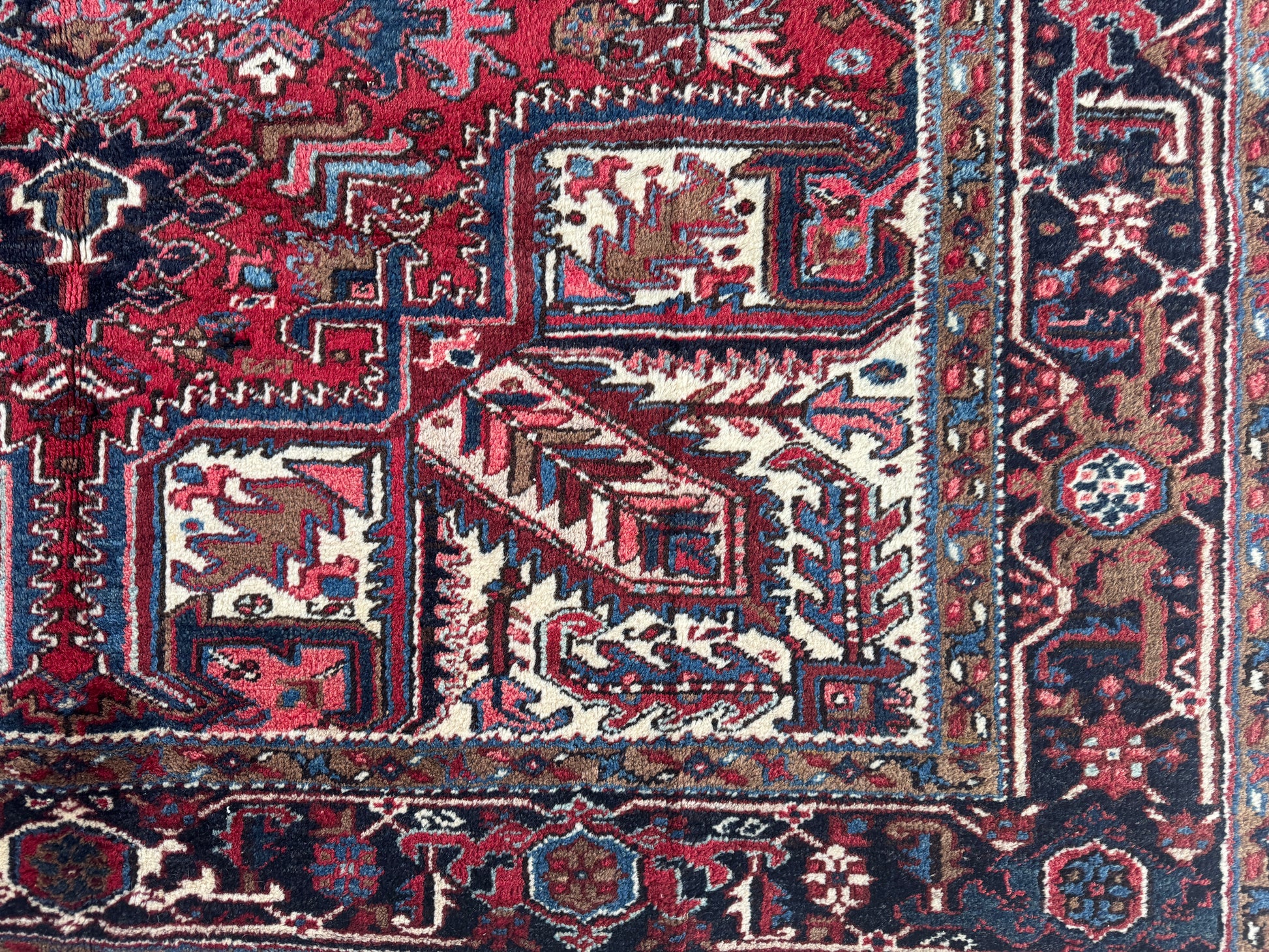 Hand-knotted from 100% natural wool, this rug features a rich red field accented with deep navy, ivory, and earthy tones. The sharp medallion structure and dynamic borders reflect the strength and character that define traditional Heriz weaving.