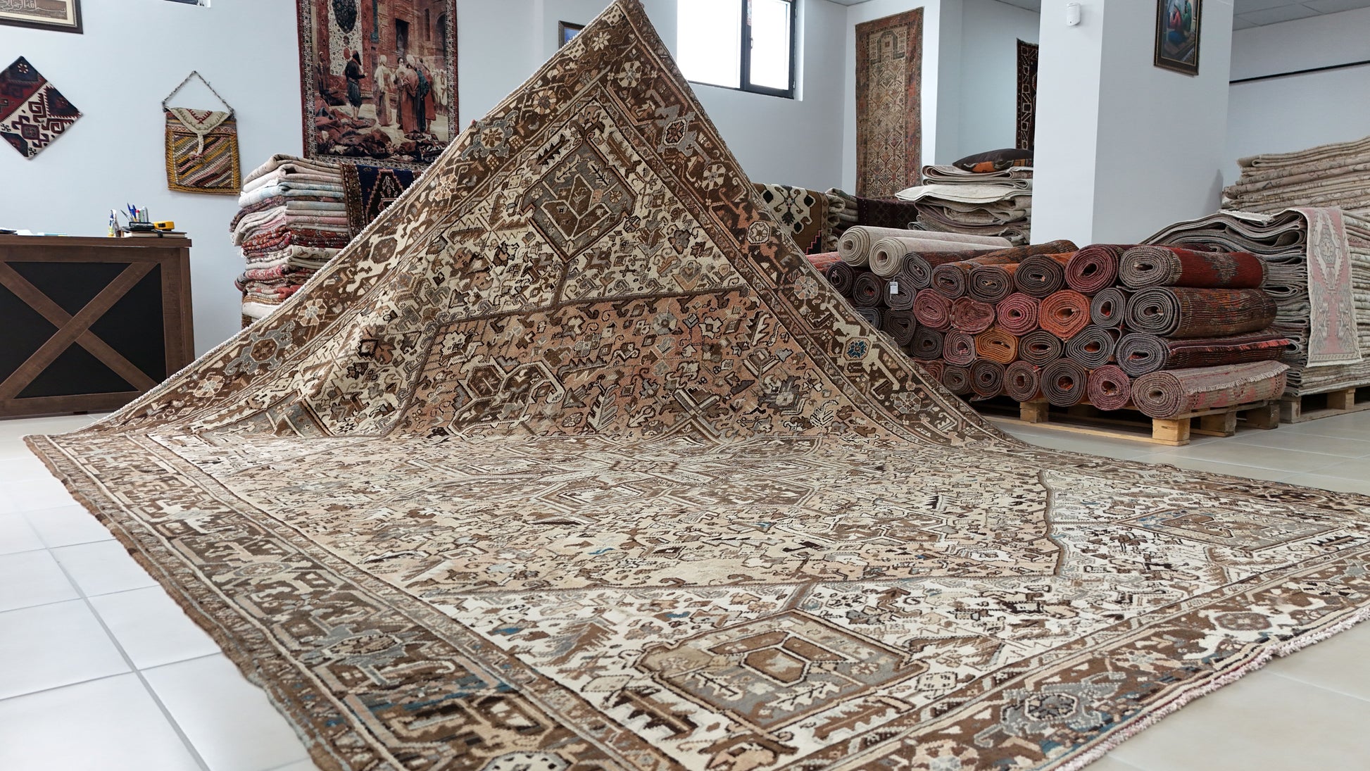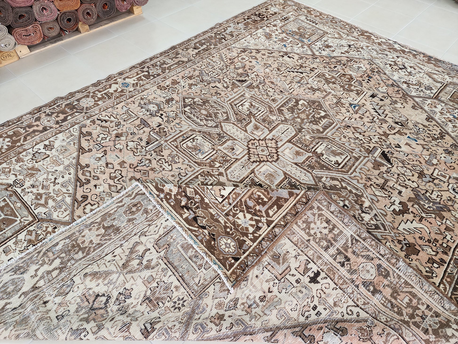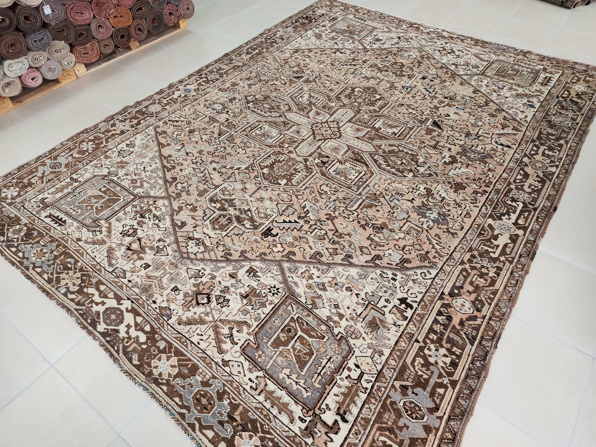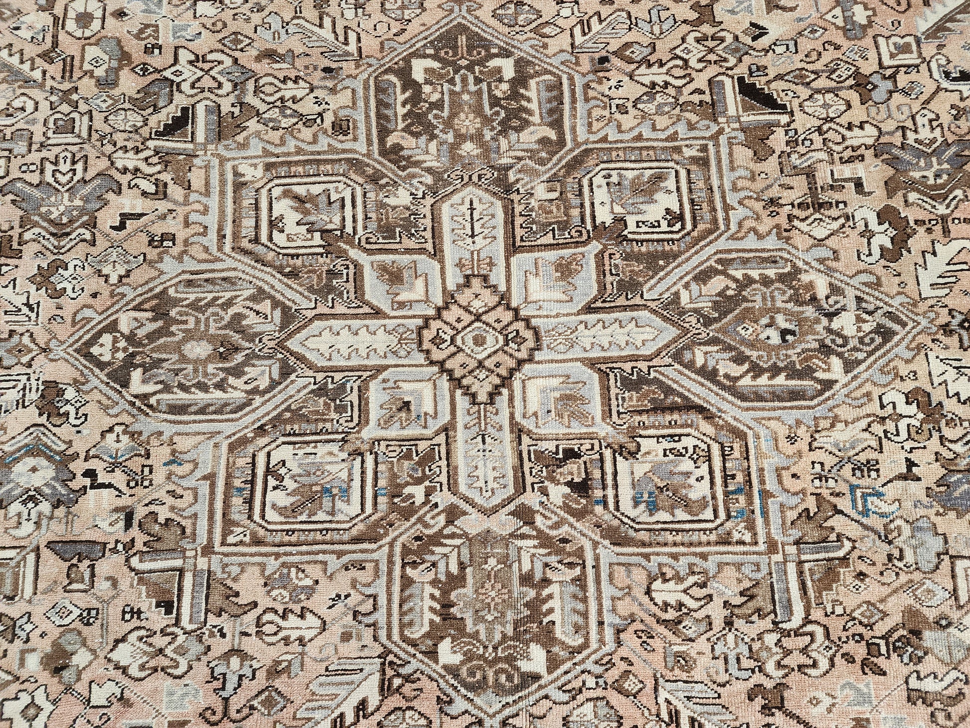 Vintage Heriz Wool Rug 9x12 ft – Hand Knotted Persian Tribal Neutral Beige Area Rug (1950s)- sku2096