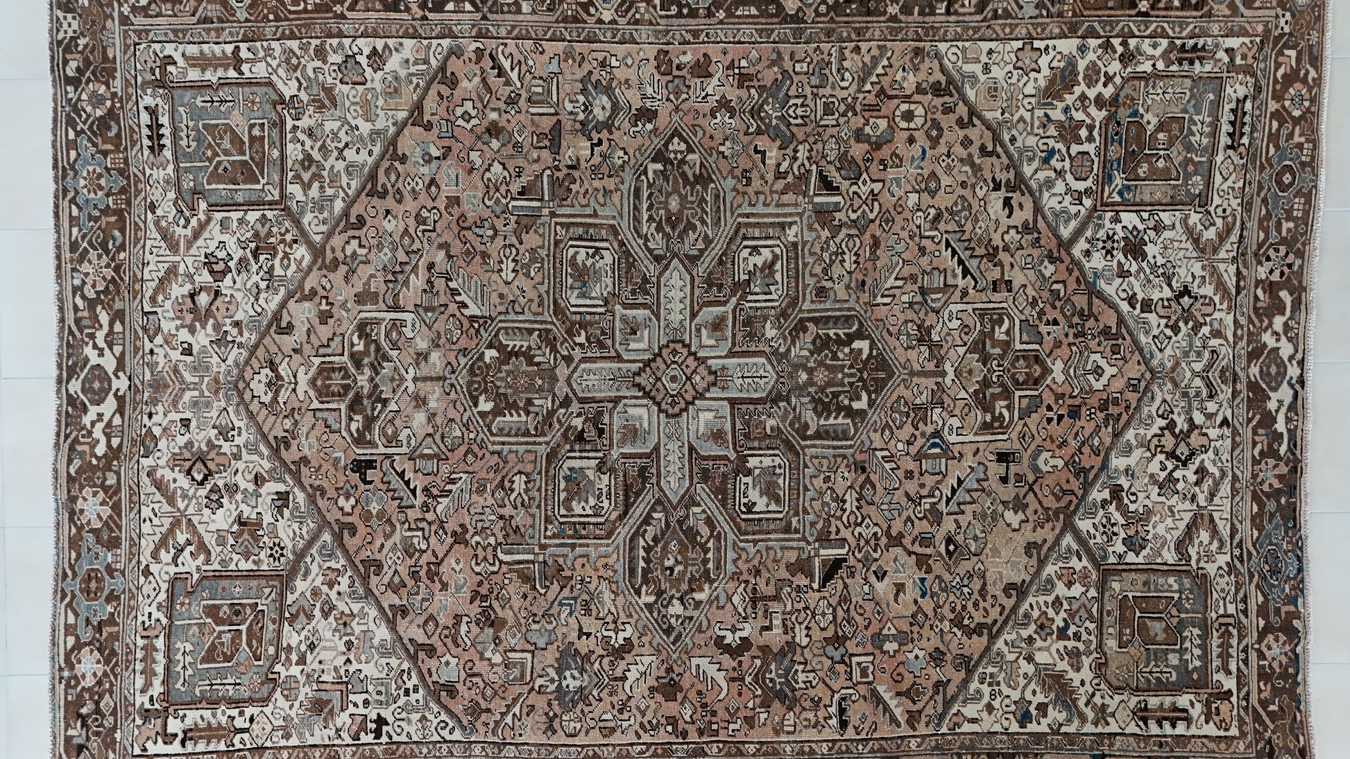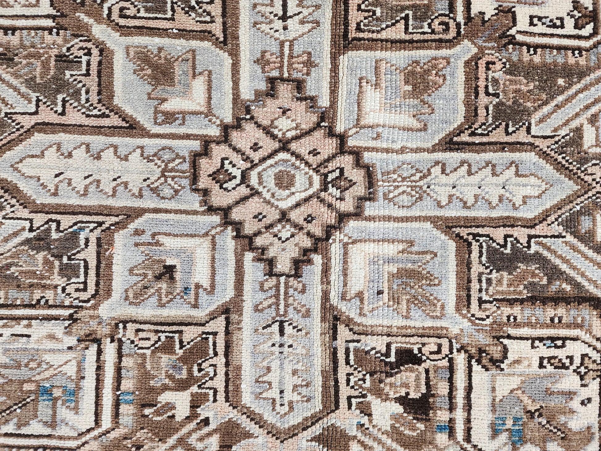 This authentic vintage Heriz rug from the 1950s is a refined example of Persian tribal weaving, admired for its bold geometry balanced by a soft, earthy color palette. Heriz rugs are known for their architectural designs and exceptional durability, making them ideal statement pieces for large interiors.